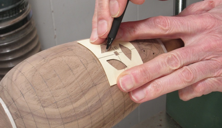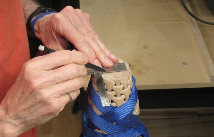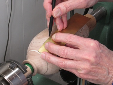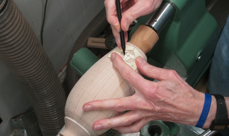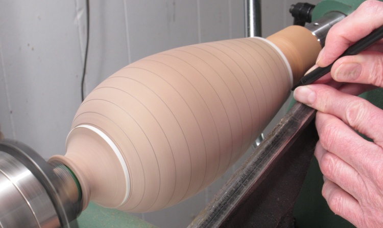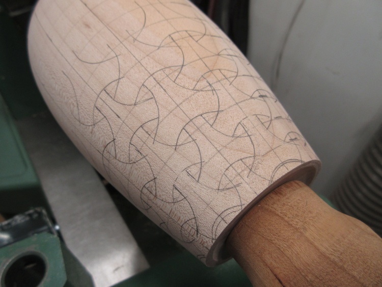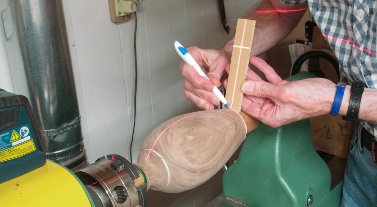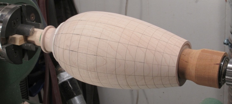 After rounding with a roughing gouge, I started marking it with lines to guide the shaping.