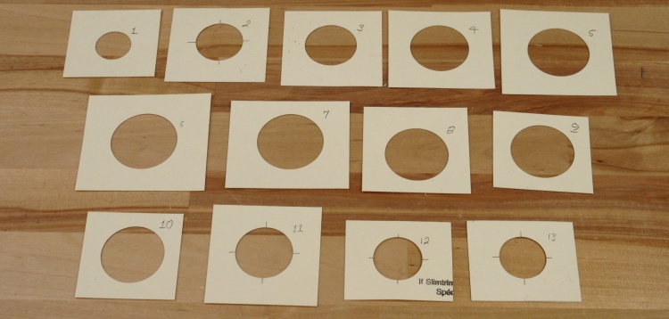 I needed 13 different sizes of circles and eventually I had all the templates neatly cut out of thin cardboard (file folder material in fact, which accounts for the colour).