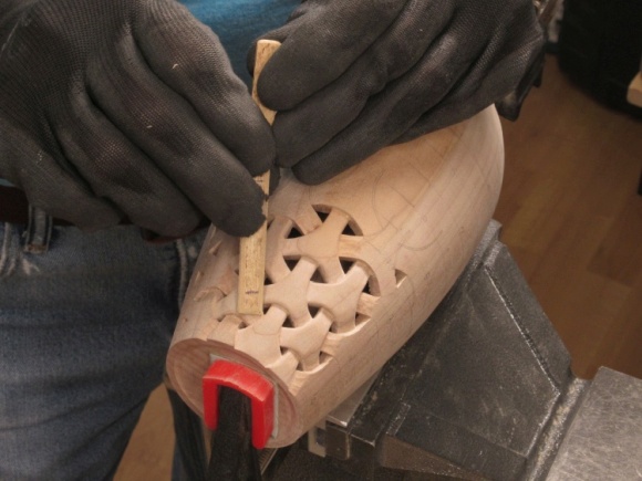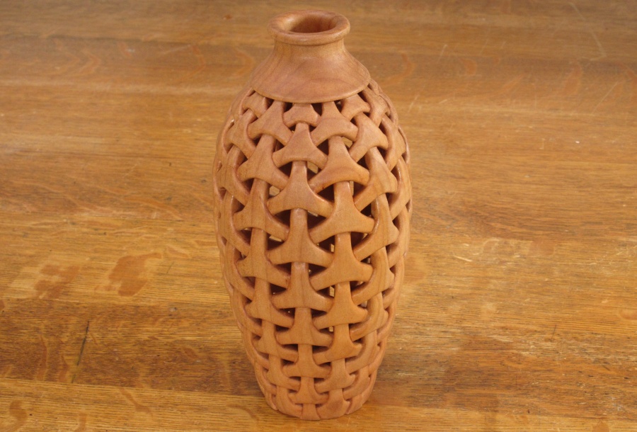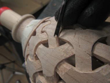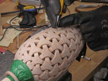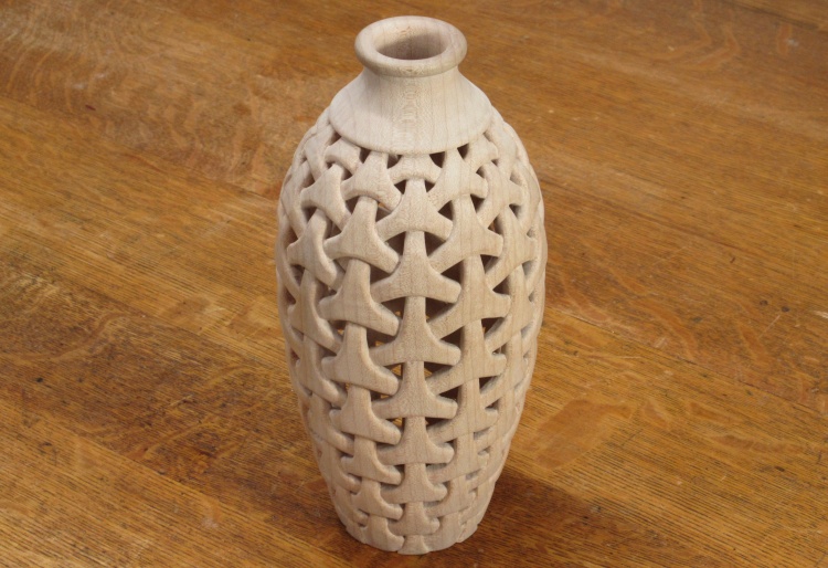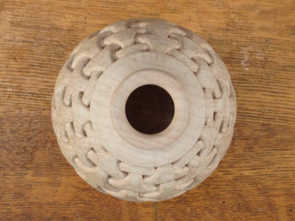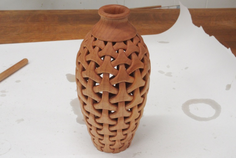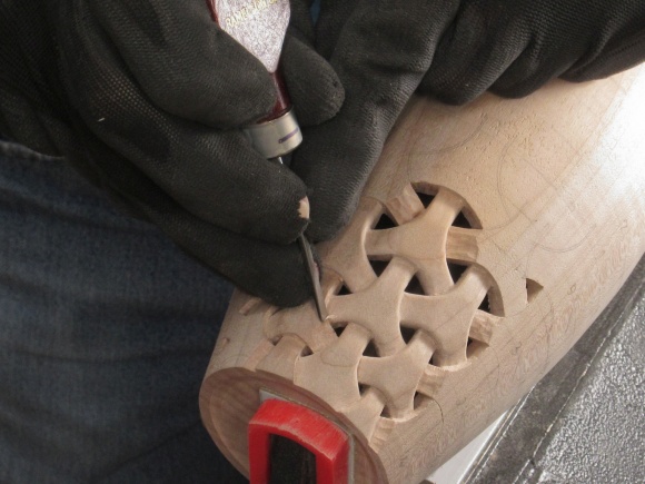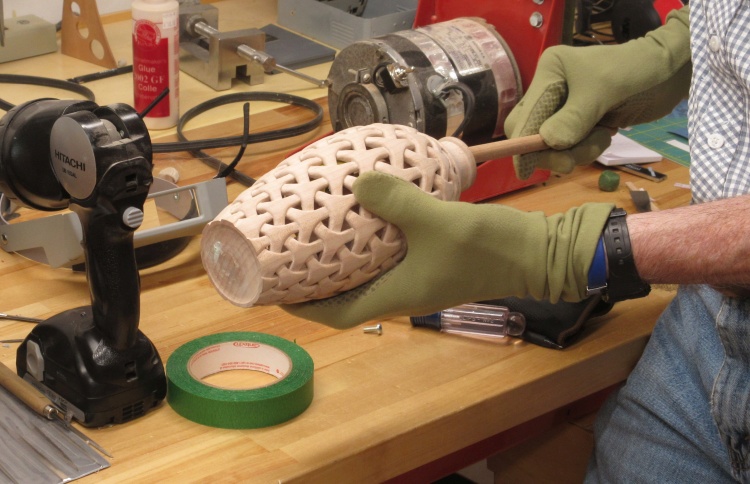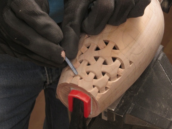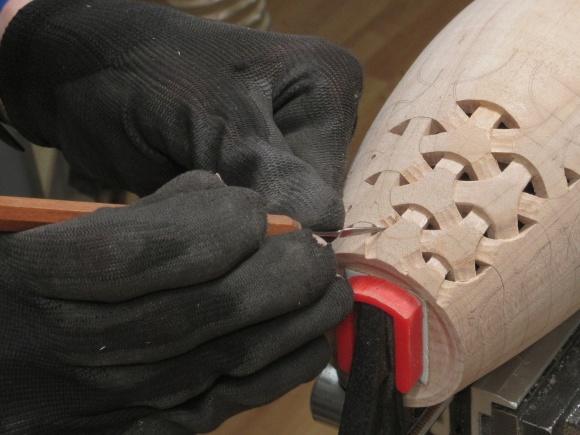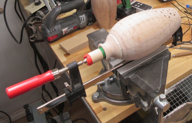 To do the carving the vessel was held in my bench vise with the aid of a clamp and a dowel that fit inside to clamp the vessel bottom.