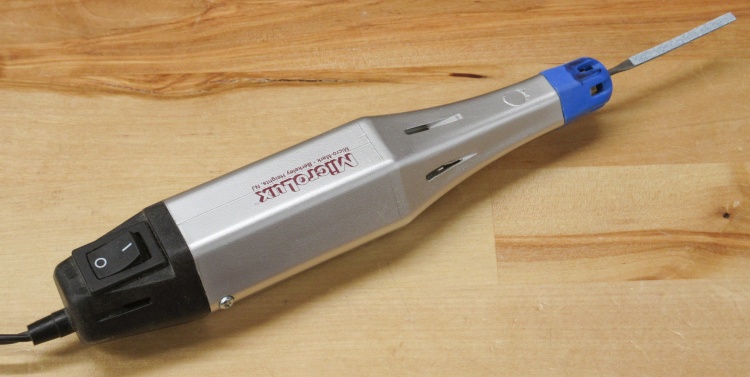 I tried my electric filer to aid in the shaping of the triangular holes but I found that the fine files it held weren't particularly effective. To improve things I modified an extra file to hold coarse sandpaper, and that worked better.