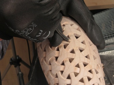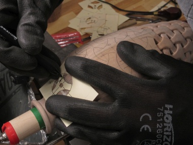 Then the carving commenced. I was able to use a small diamond-coated disc on a rotary tool to make the short lines forming the weave pattern, which ironically took little force and didn't really need the vessel to be securely held.
