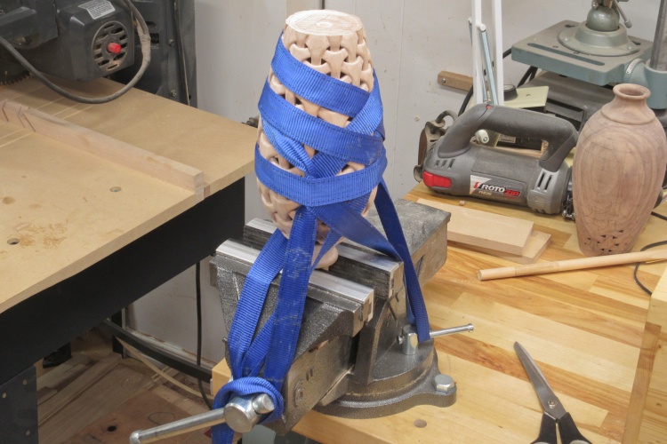 I was going to need the vessel held securely to be able to carve the bottom so I put the center dowel back in to hold it vertical and strapped it to the vise. That provided a secure grip on the vessel with little danger of damage to the carved walls.
