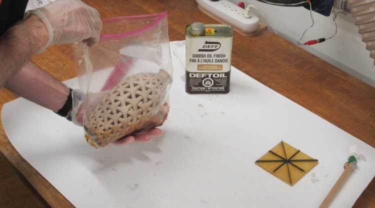 I used an immersion technique to make sure I covered all the surfaces inside and out. The wood needs to be kept wet with the finish for half an hour and then any remaining gets wiped off.