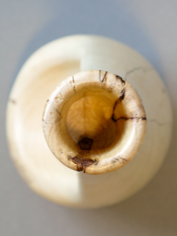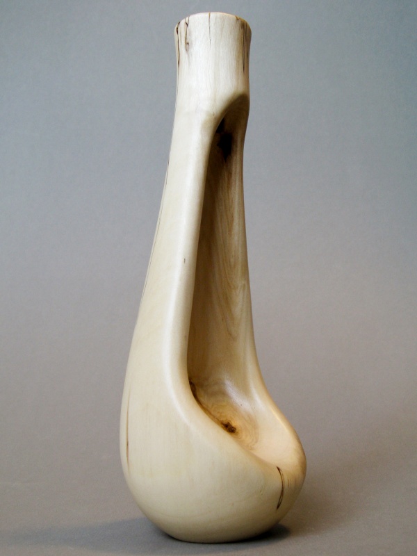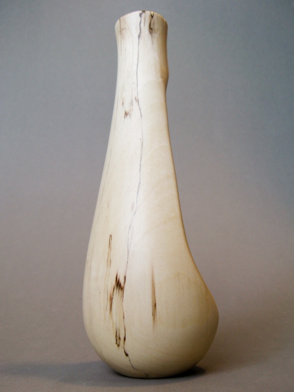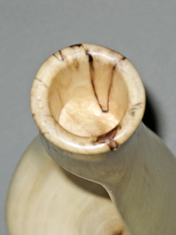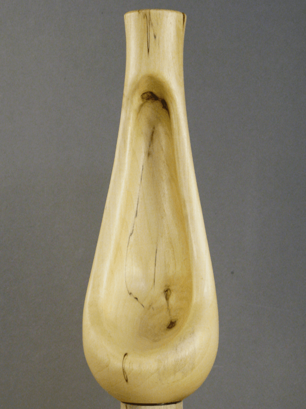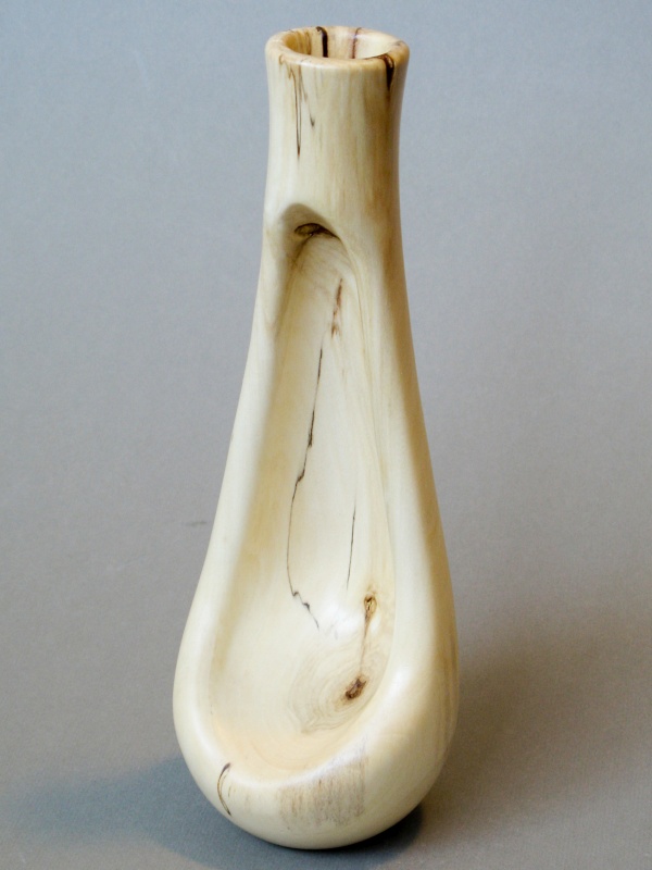 Poplar is a pretty soft wood, so I needed a "subject" that didn't have much fine detail. I thought it might be interesting to make a vessel that looked like it had the side sucked in, hence the play-on-words "vacuum flask" name. Unfortunately, it ended up looking to my eyes more like some kind of funky chair. But there is some interesting spalting in the wood, and the center of the branch was a thin dry brown section that was exposed a bit more by the carved-out section, so it is not a total loss.