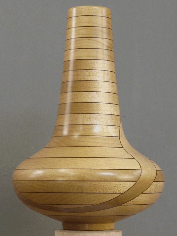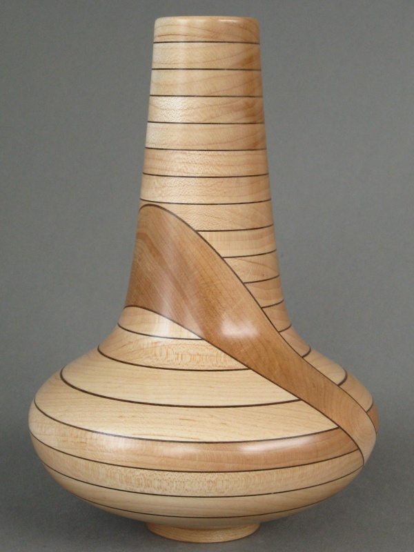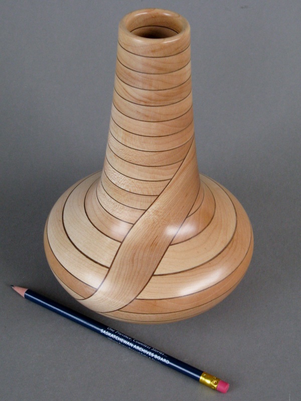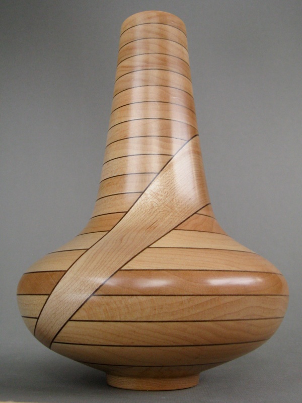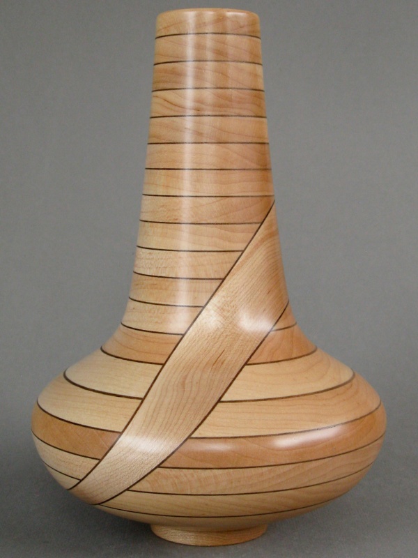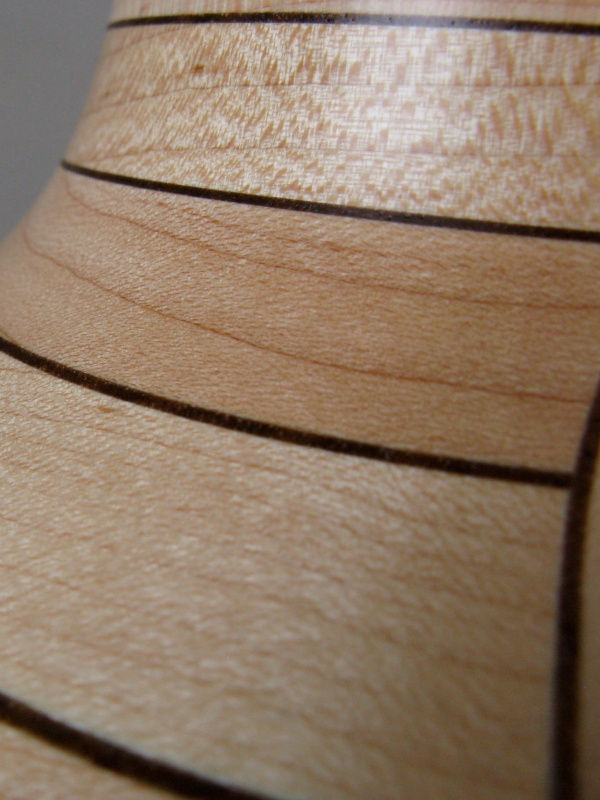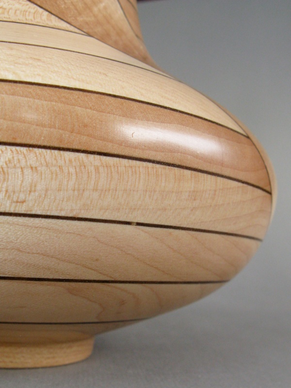 Obviously whatever I made was going to be laminated and I stuck with a turned vessel since I was on a bit of a roll with those. This one uses a variation of the slice & fill technique used on my last vessel, but instead of a thin "fill" layer it used a wedge-shaped section. Meanwhile the maple layers alternate with thin walnut layers to help emphasize the shape. As usual the
