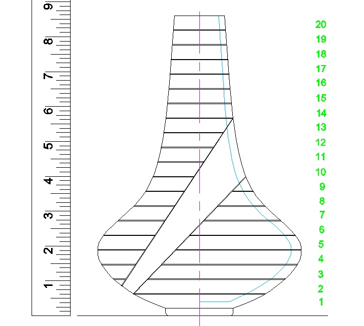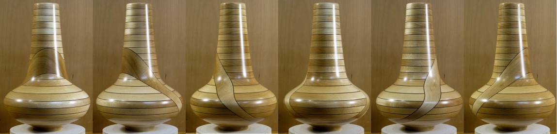 The "use up the scraps" impetus for this vessel put some constraints on it including of course the material, the diameter and since it made sense to use most or all of the scraps, the height. I had found the look of the body of the original vessel a bit bland so for this one I added some walnut layers to spice it up a bit, and of course the big wedge. I ended up chosing an odd shape for this vessel, thinking that might make the profile of the insert look a bit more interesting. I'm not sure that quite panned out, but at least it's a bit different looking than most of my other efforts.
