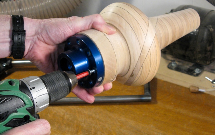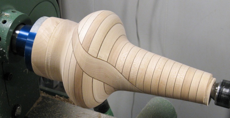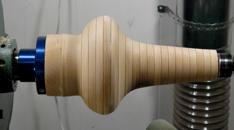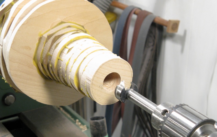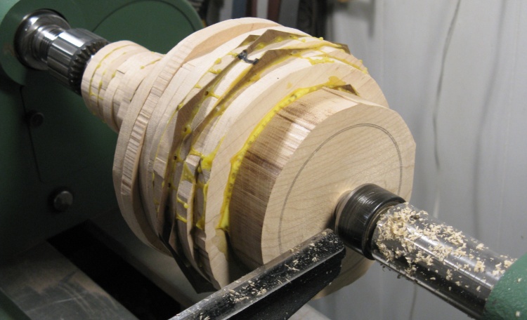 Since perfect symmetry and flatness is hardly to be expected after clamping and gluing 40 or so layers, the blank was mounted on the lathe so the bottom could be flattened.