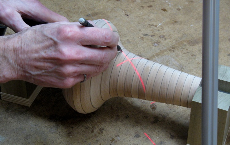 That meant that I needed to mark the cut lines on the vessel. Given the irregular shape, a laser line seemed like the ideal guide. Here a laser has been mounted pointing down on a tripod above the vessel and I'm tracing the laser line with a pencil to mark one of the cut lines.
