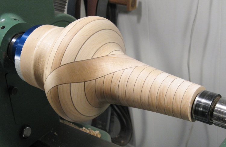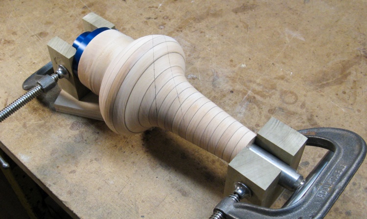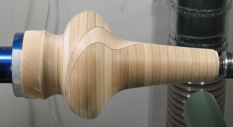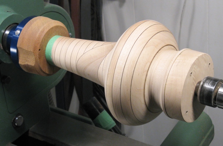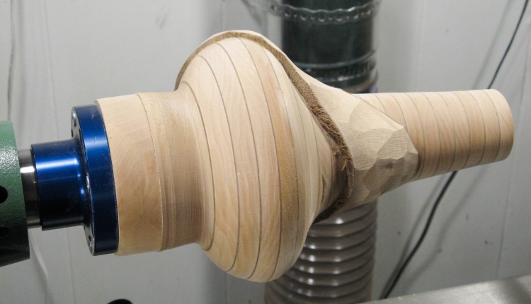 It was shaped a bit oversize to have room to make adjustments when re-turned later. I left the bottom half-inch or so to be done after the vessel was swapped end-for-end because there would be more room to work on it.