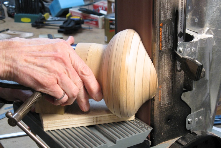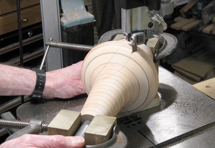Here the large-diameter sections on the bottom are being removed. After that, the bottom foot will be cut, the underside profile blended in, and then small scrapers will be used to shape the section right on the bottom.