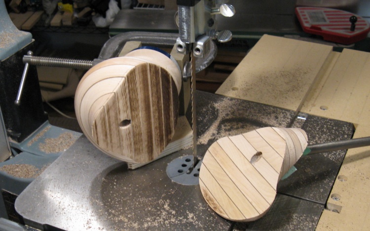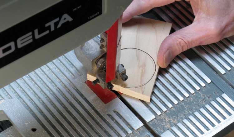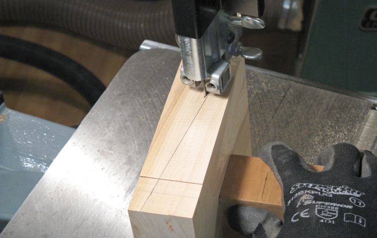 In this photo the bandsaw blade is partway through the first cut. Handholding the piece gives a wigglier cut, but it lets me compensate for any blade wander. I was aiming to cut about 1mm inside the pencil line.