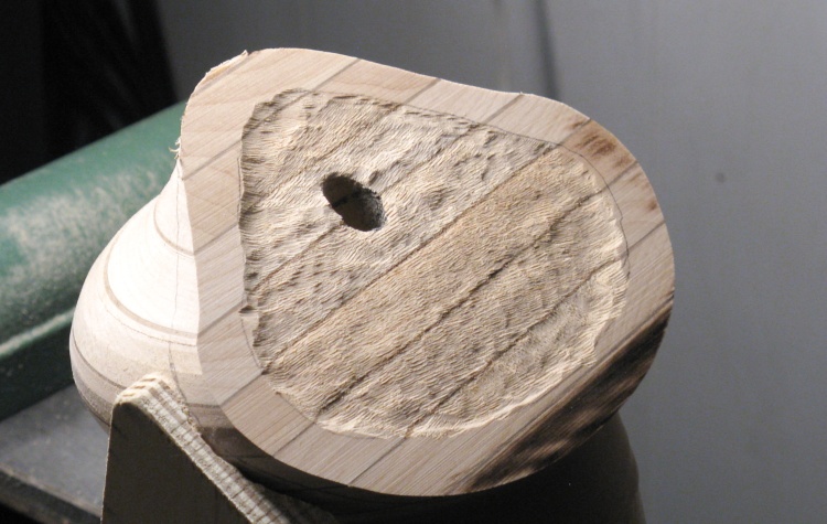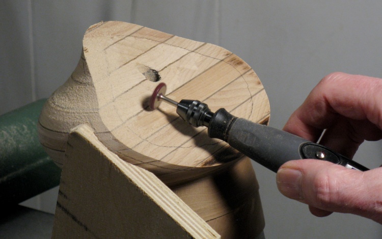 On the end covering the hole was still the little piece of 1/4" plwoood that had been stuck on with a latex adhesive I use as a temporary glue. This shot shows it being pried off with a little dental spatula so the hollowing can start. Any glue left on the surface can just be rubbed off with a finger.