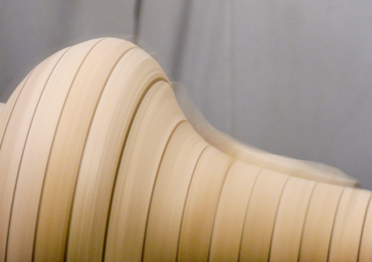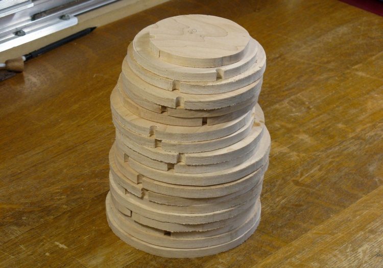 In making the original maple wastebasket vessel, the centers were cut out of each of the layers which produced the pile of irregular discs seen here.