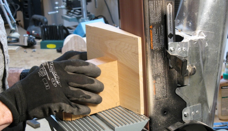 The bottom and one edge were jointed to get them flat and at right angles. This would be cut into a wedge freehand on the bandsaw so I added a square piece of wood that would hold it vertical and also act as a handle.