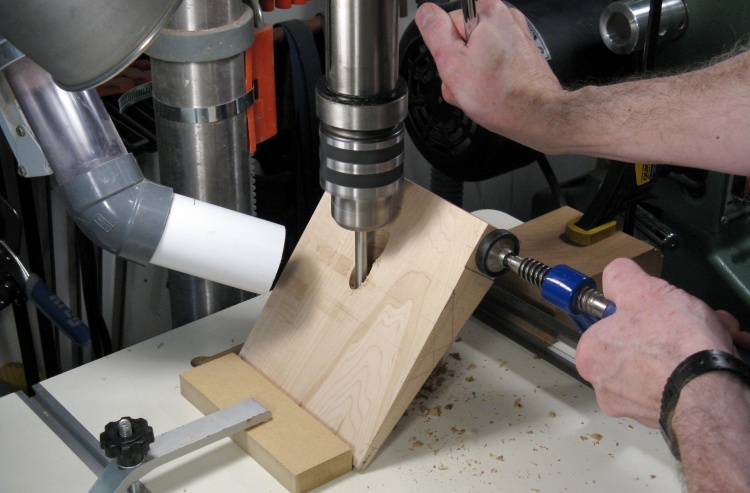 I started by adding the wedge to the bottom piece. Positioning was critical so to make sure it would stay in place when glued, I drilled a couple 1/4" holes and added dowels to lock it in place.