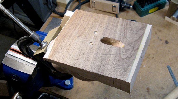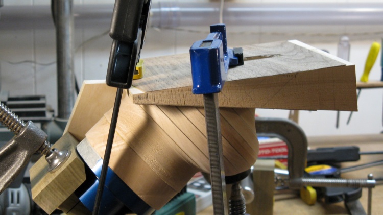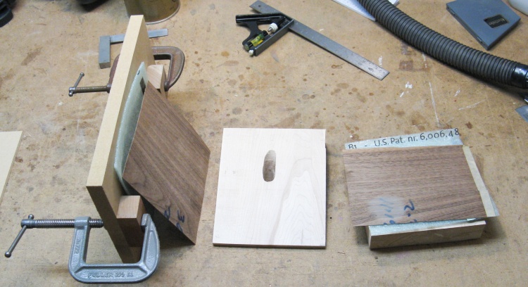 Next up was to add the veneer to the wedge. I made a temporary gluing jig out of some scraps including the cut-off part of the wedge.