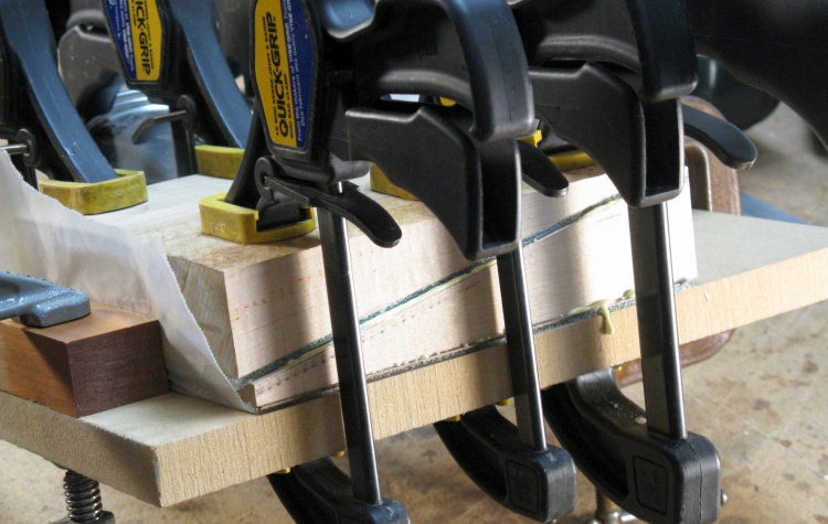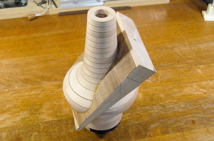 To add the top, the metal guide rod went in to align the centerlines of the two pieces. With a layer of glue, the top was set in place and a few clamps applied. The slope of the wedge made the rotation of the top automatically align with the bottom.