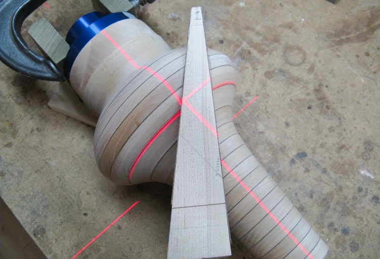 Once again the laser was deployed, this time using it to align matching layers in the top and bottom pieces while just sitting on the bench. I fine-tuned the wedge position and did some touch-up sanding on the top until things aligned correctly.