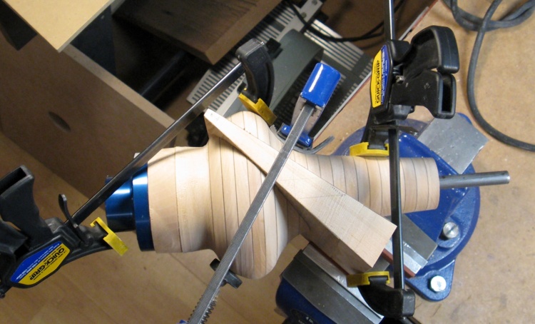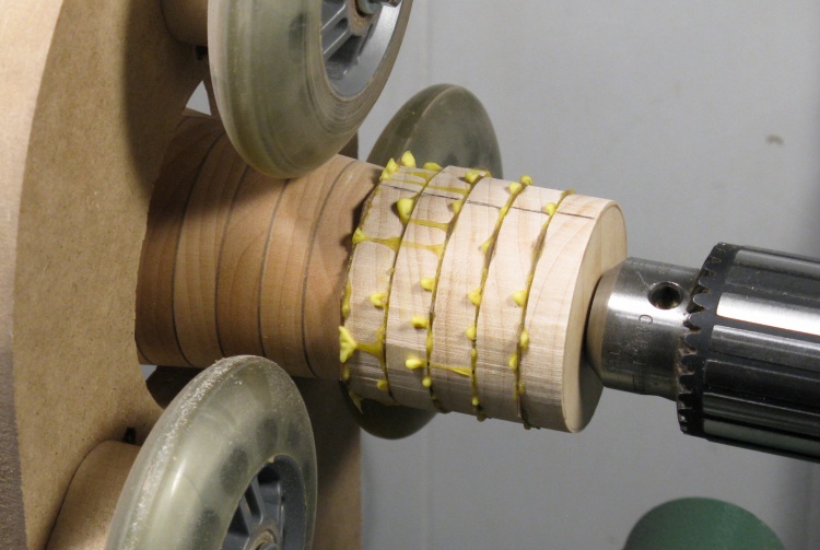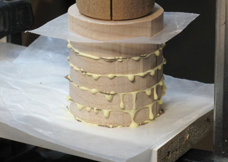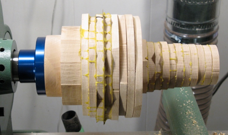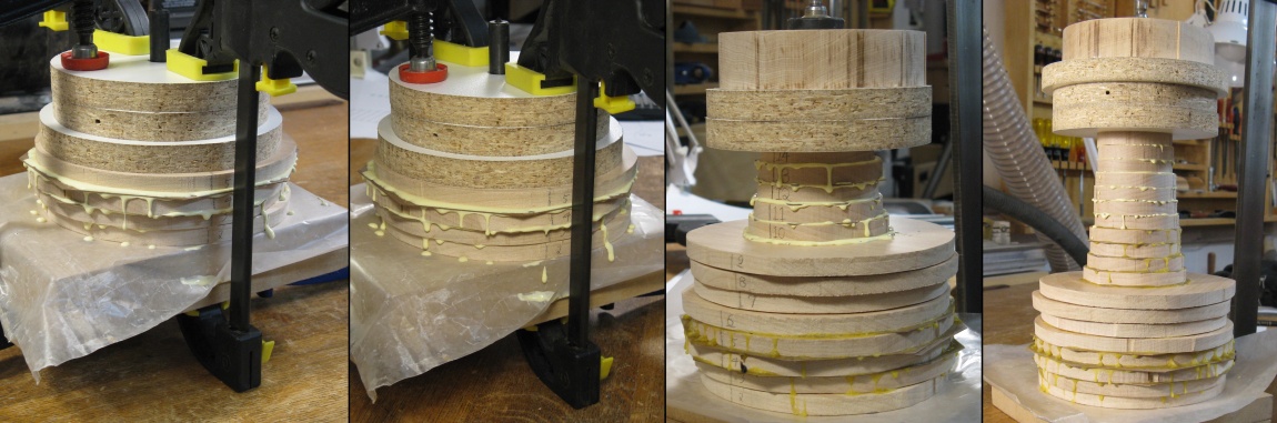Then they were all stacked with a guide rod in the center, glued and clamped to make the new end for the vessel.