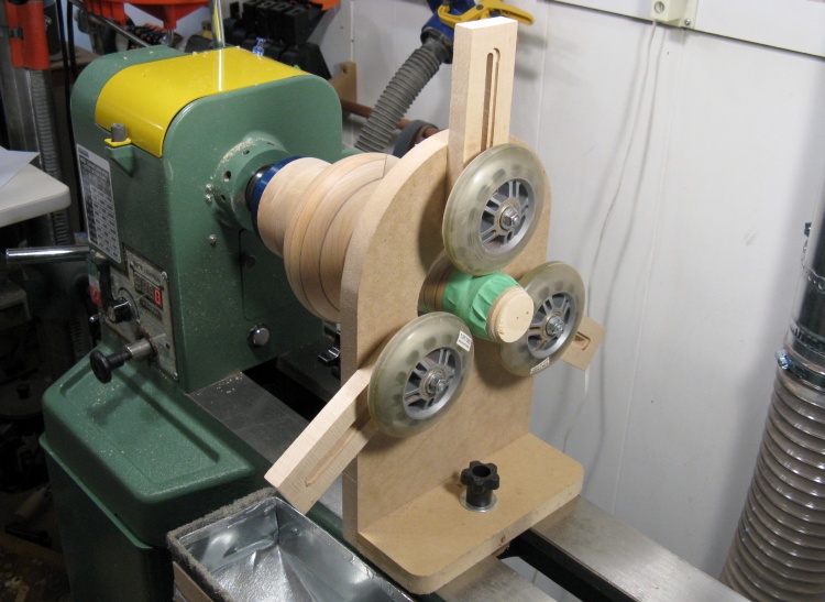I made a small jam chuck to hold the top, which simply consists of a piece of wood with a hole into which the top fits tightly.