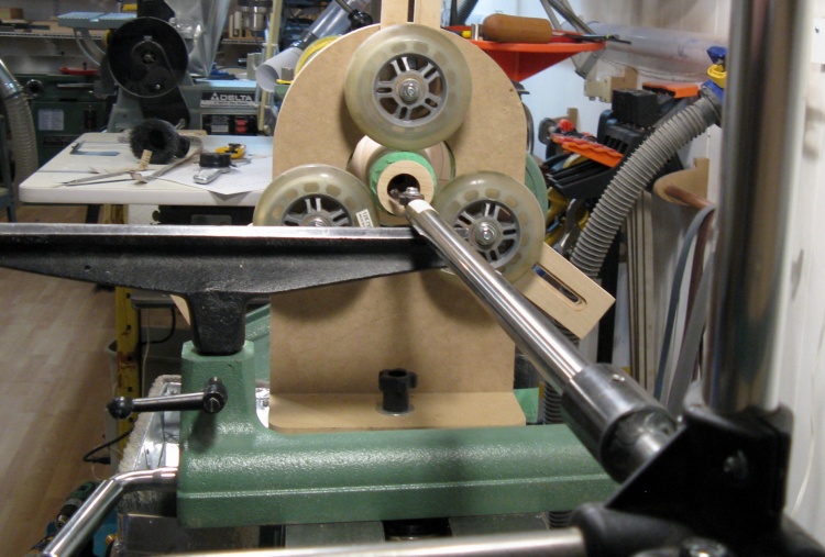 To set up for hollowing I moved away the tailstock and installed the steady rest. I used a small plastic ring (cut from a central-vac pipe) as a shield for the wood, taped on with liberal amounts of green masking tape.
