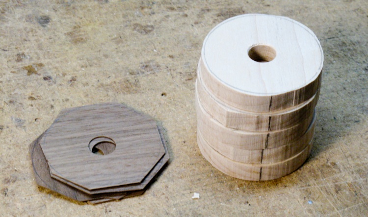 And like before, the walnut veneer was marked and cut with a ruler and knife into octagons. Those and the maple discs were drilled with 1/2" holes.
