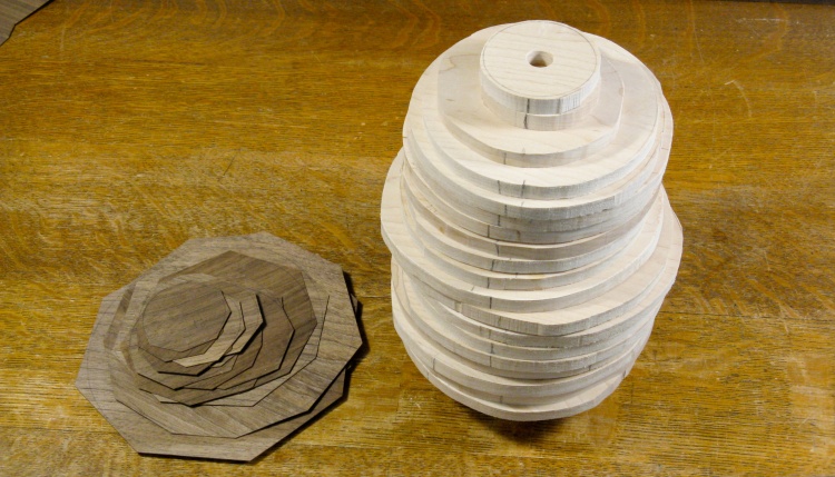 I failed to think of any clever way to cut variable-sized circles out of veneer sheets, so instead they were just manually cut into octagons using a razor knife, ruler and grim persistence.