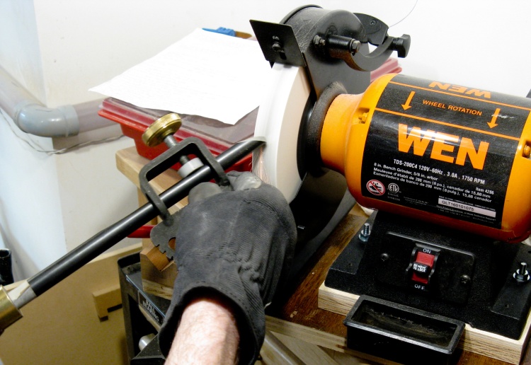 Turning tools cut a large volume of wood so they need to be sharpened frequently. Here I'm sharpening my favorite bowl gouge on the abrasive wheel, using a jig that controls the grinding angle.