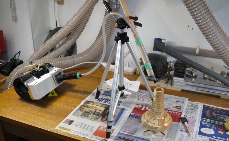 Since the finish on my last vessel (much more open than this one) had some trouble drying inside, I rigged up a little hose-based blower to get some air flow inside to help things along a bit.