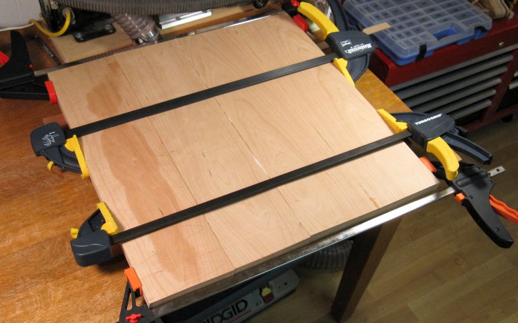 The four pieces were edge-glued together to make one large panel. To simplify the process, I first glued together pairs and then here the two pairs are being glued together.