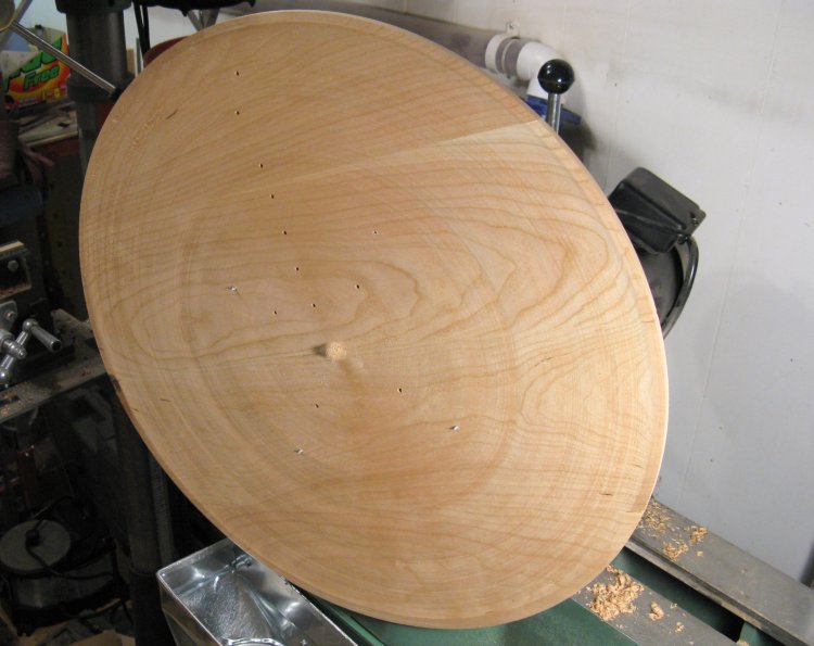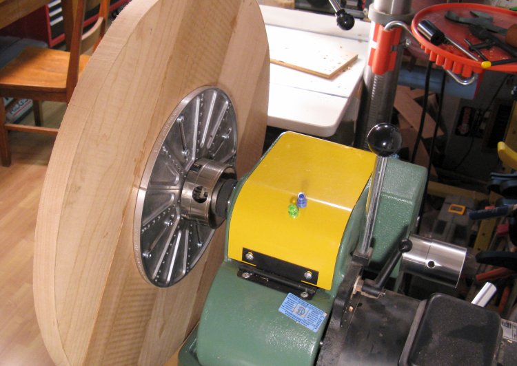 Here the wood has been mounted to the lathe. You can see the eight mounting holes and it looks a bit like the screws are sticking through, but those are just wood chips since the screw ends don't reach the surface.