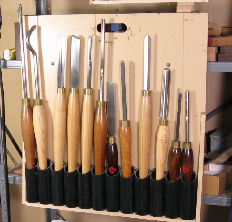 And we'll take a brief tangent here to show the large turning tools that I used. This is a bit of a mismatched set (bonus points to spot the home-made handle). The tools vary in length from 26" on the left to 16" on the right. All arranged in the finely-crafted painted-wall-panelling-and-pipe holder (with convenient carrying handle) that gets hung on the shelf beside the lathe when needed.