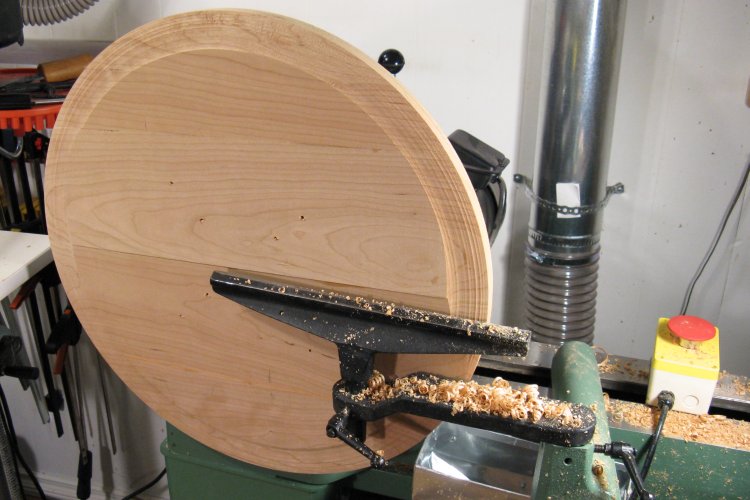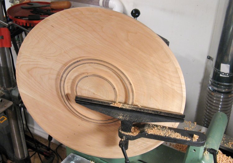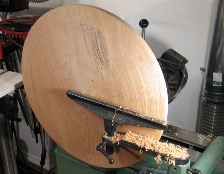 The front of the piece is slightly convex with about 1/2" of curvature over the 22" diameter. Here the front is mostly shaped. The dark area is a low spot (scribbled upon with pencil) down to which everything else must be cut to maintain a smooth profile.