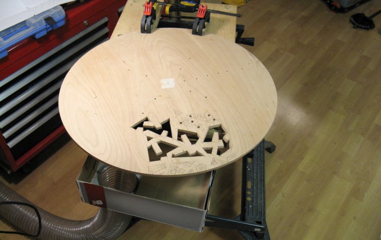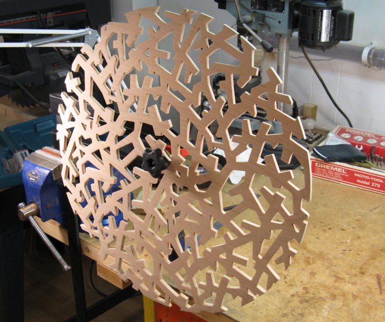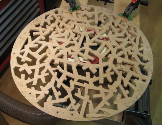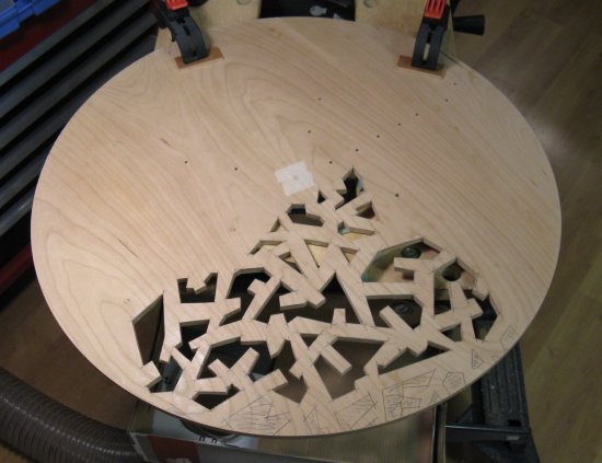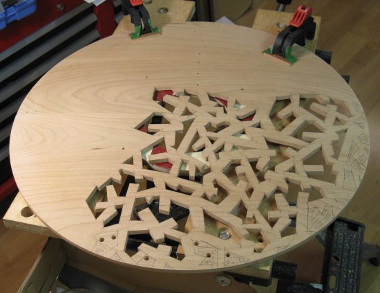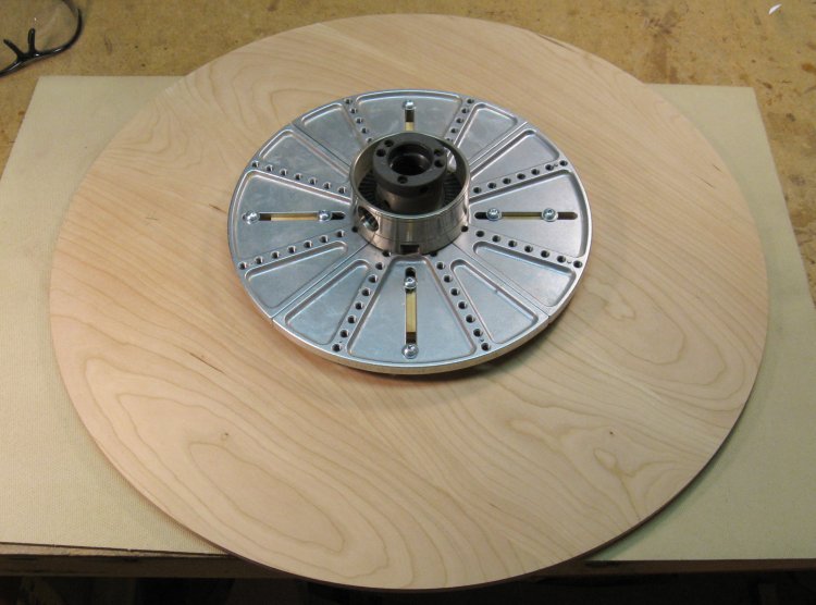 This is a shot of the pattern with the chuck slots and mounting holes marked. The hole locations were transferred to the wood and they were drilled right through for the screws.