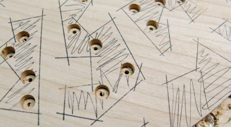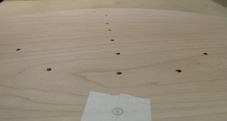 Here you can see some of the completed edge holes. There are still some carbon-paper marks that need to be removed. This was done by hand-sanding the top side using a sanding block.