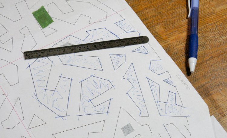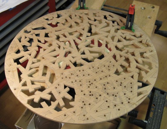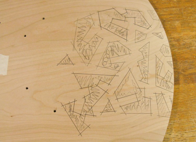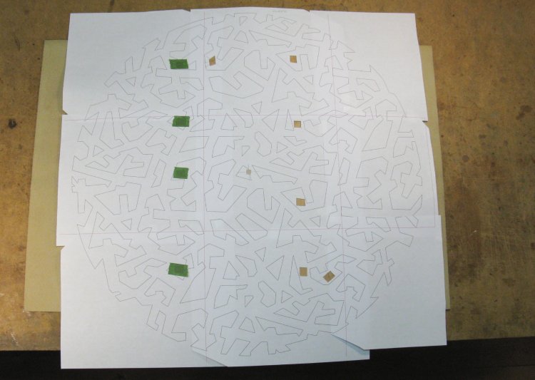 I made a full-sized pattern that could be positioned on the wood. Of course the average printer does only 8.5 x 11 sheets, so the pattern is nine sheets taped together. I cut out some holes for alignment and taping and here the pattern can be seen taped down to the wood.
