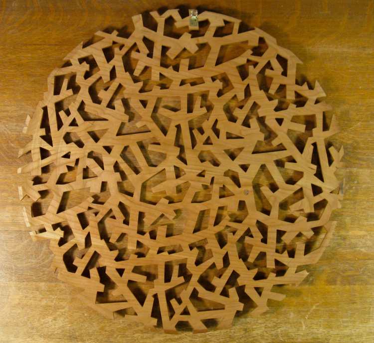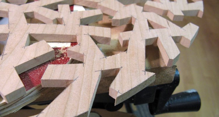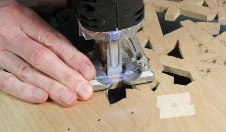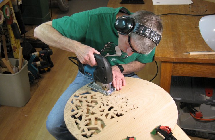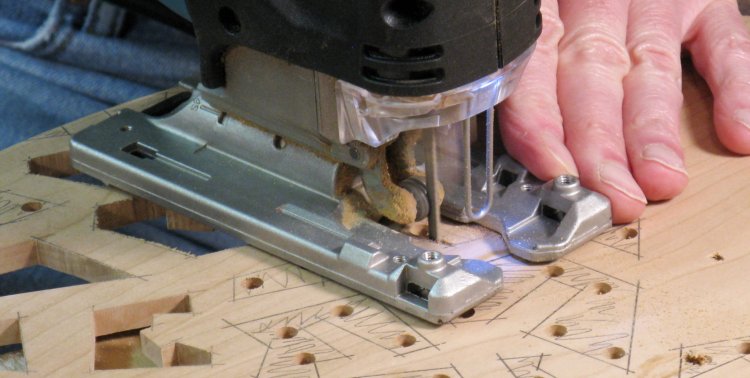 After some consideration, I settled on using a jigsaw to cut out the shapes. I couldn't see doing it with a hand saw or even a scroll saw, however I was concerned about the noise and vibration of the jigsaw. A buddy of mine once said that the jigsaw was the most possible noise for the least possible effect and I completely agreed since I had endured years of the cheapest crappiest B&D jigsaw. However, I finally splurged for a good one which is well made, has tight tolerances, a selectable speed, an adjustable aggressivness of cut and even a light. I used a narrow blade, a low speed and a non-agressive cut setting and this actually worked very well.