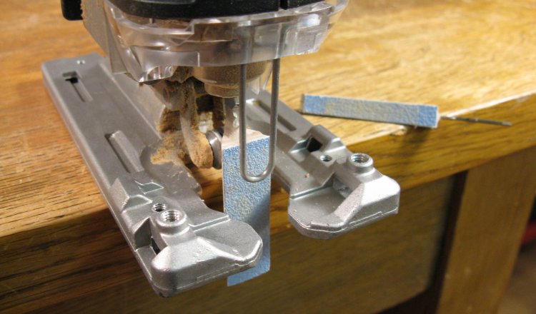 And here the sander is shown mounted to the jigsaw. I made a second smaller one as well which can seen in the backgound. These are swapped out the same way as the blades - just work the blade release and remove or add one.