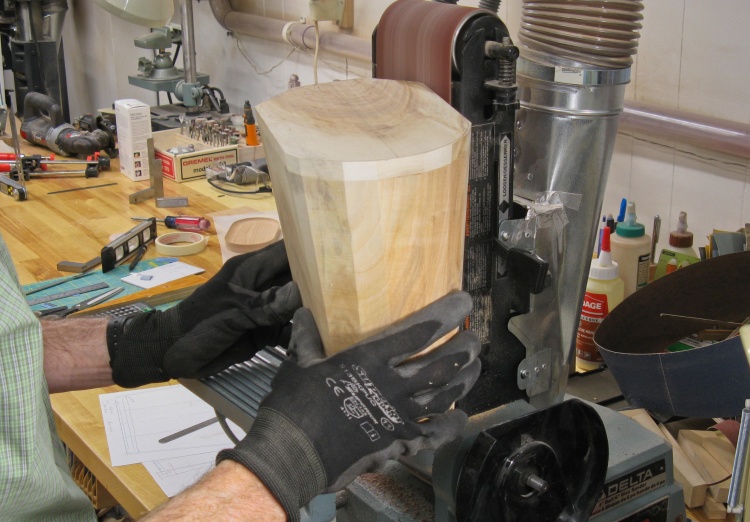 Then it was time to get it rounded. I started by using the bandsaw to cut appropriately-sloped 45° angles from the corners.