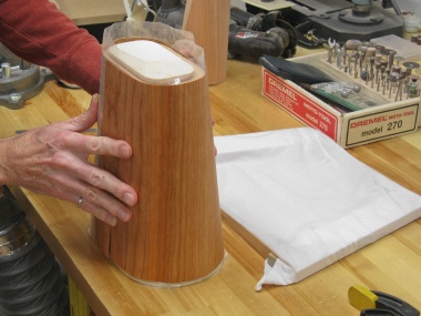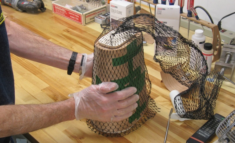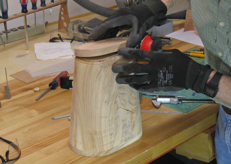 This shot shows me fitting the completed base onto the bottom of the form. The form has been shaped along the bottom edge so it clears the rounded inside of the base.
