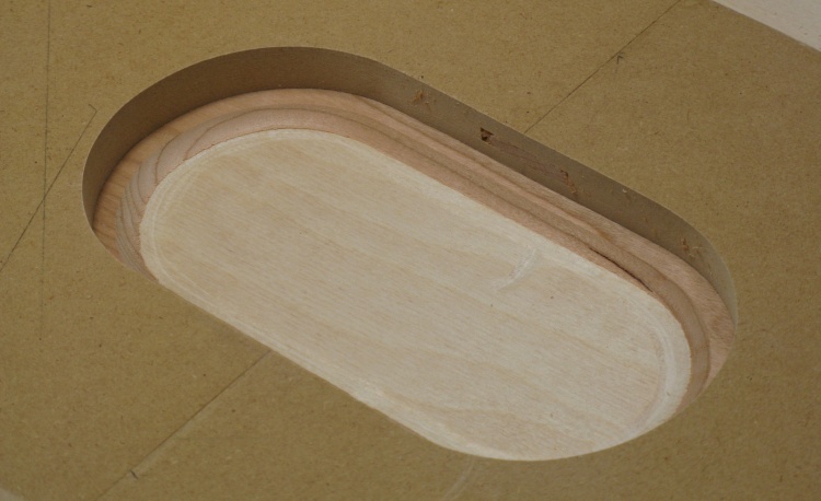 I started with the foot piece; the blank for that was laid over the oval pattern hole and held in place laterally with taped-on scraps of plywood and vertically with the diagonal brown board.