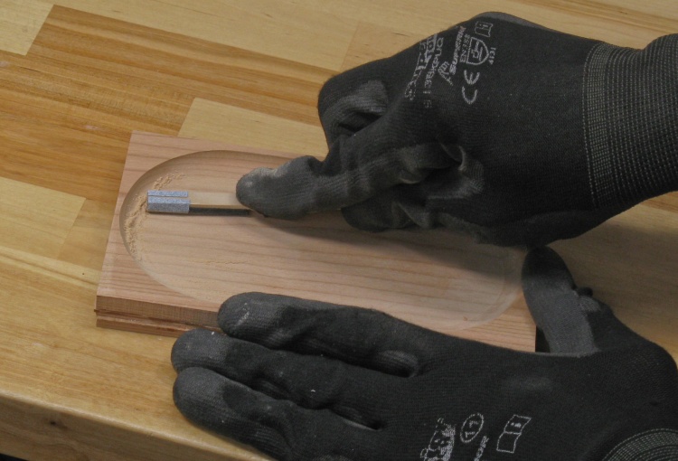 The inside of the oval foot still had a sharp inside edge from the routing many photos ago. That was rounded off with a Dremel-mounted flap wheel and smoothed with hand sanding.