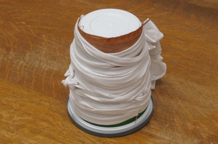 This is a test of the bending technique. I've cut a small piece of the veneer, soaked it in warm water and then bent it around a plastic container. It is held in place with a (perhaps overgenerous) wrap of stretchy material.