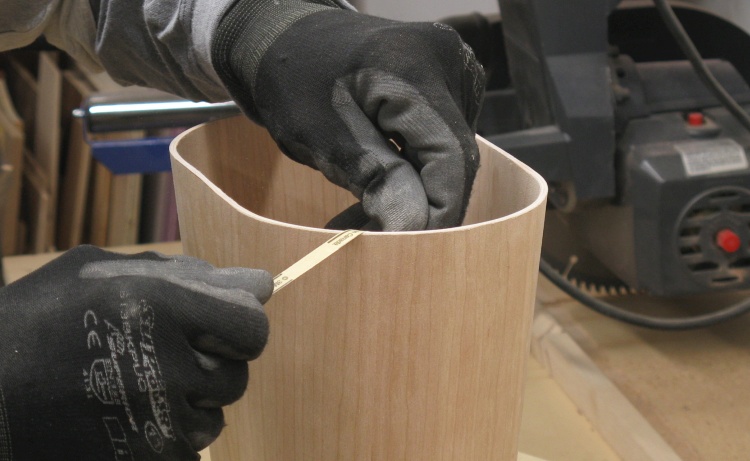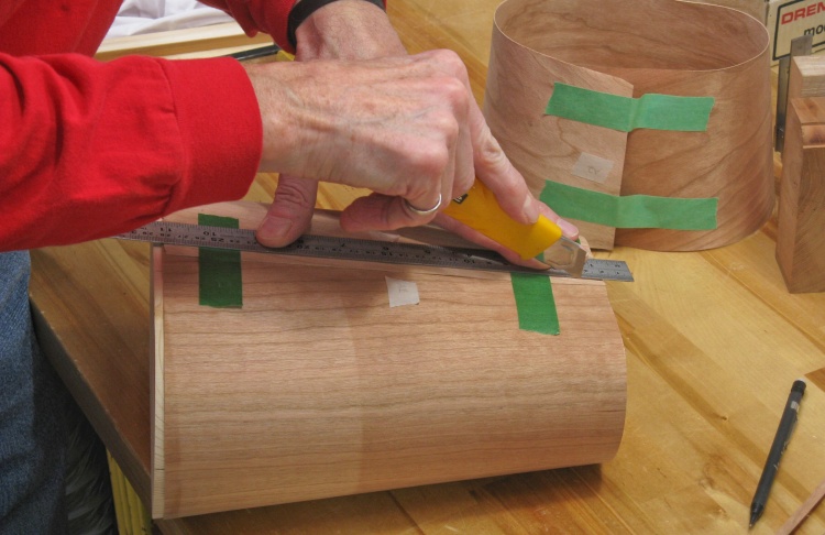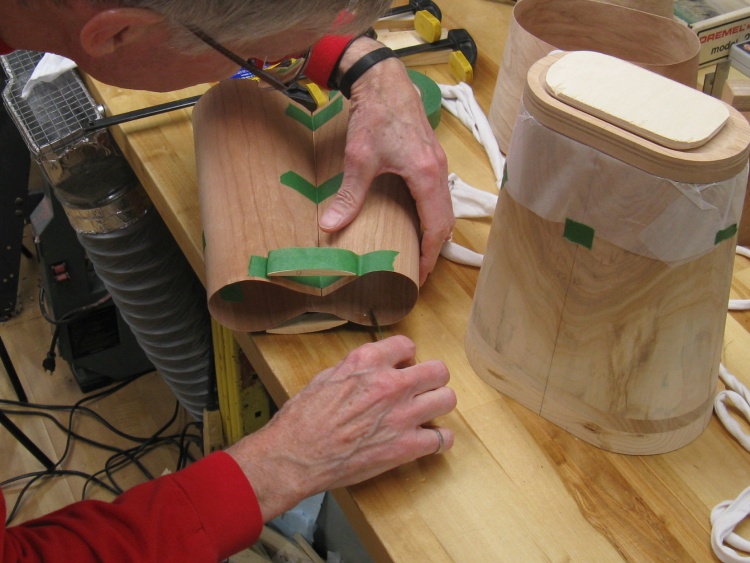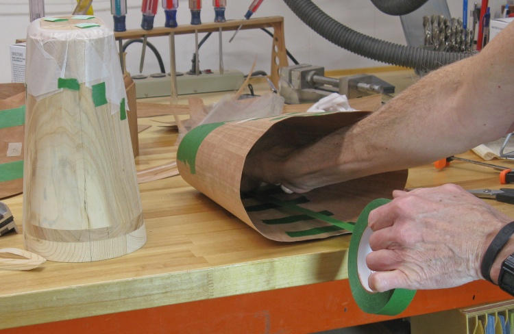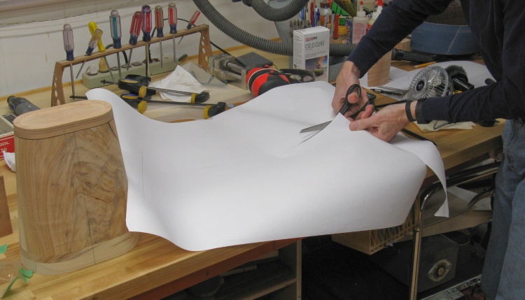 To make it easier to cut a piece of veneer that accurately wraps around the form, I first wrapped the form in paper, marked the edges and then cut out the pattern.