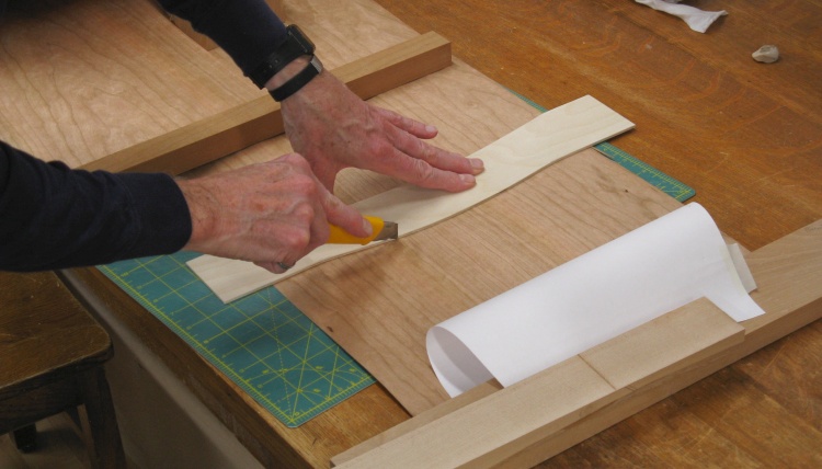 To make it easier to cut the veneer consistently, I decided to make a cutting pattern for the top and bottom of the smaller vertical-grain pattern. I used a scrap of 1/8" plywood and made curves on either side that corresponded to the top and bottom curves of the pattern.