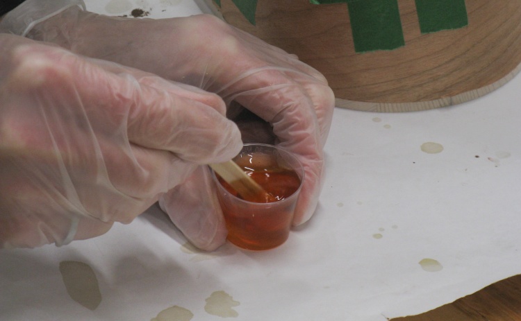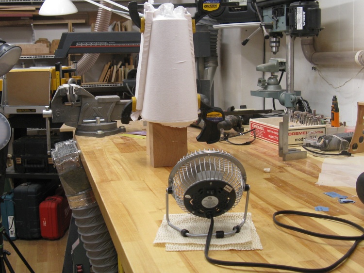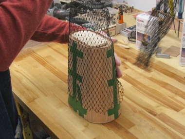 In this shot the first coat of varnish on the wastebasket is drying.