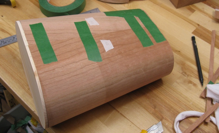 This shows the final veneer layer prior to gluing. Six patches of tape on the right cover the inset diamonds. The three thinner strips of tape strengthen the veneer to prevent splitting when it is tightly pressed over the form.