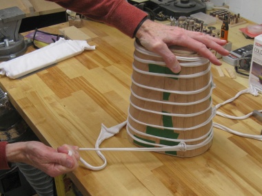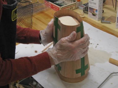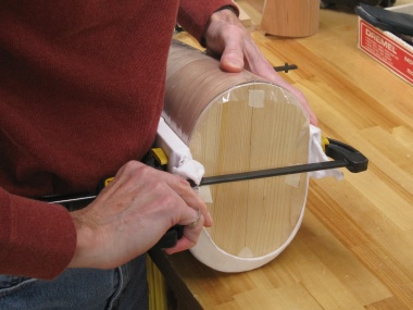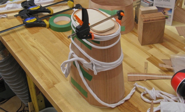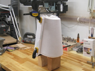 The glued layer was slid down over the form and base and then wrapped and clamped to apply pressure while the adhesive set.