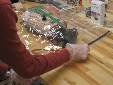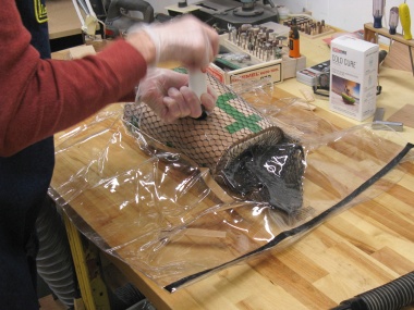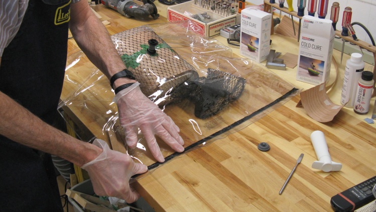 The next step was to prep it for the vacuum press. Here the "breathing mesh" is being spread over the veneer layers. The mesh provides a path for air to be removed via the vacuum pump.