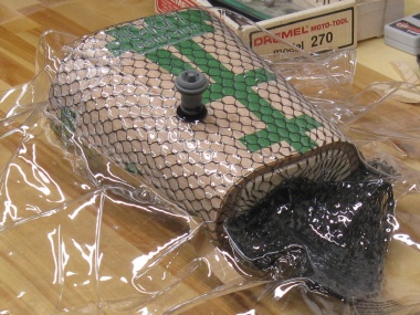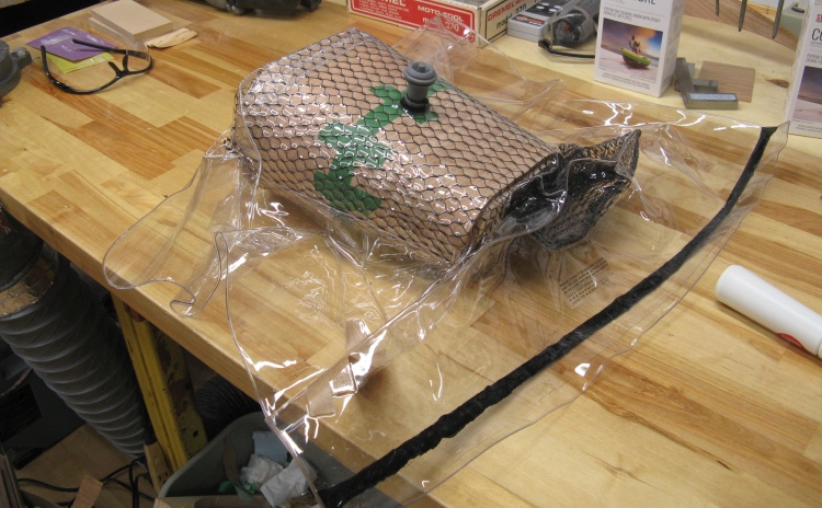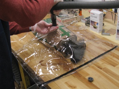 That meant I would have 5 minutes to mix the epoxy, spread it evenly on the form, add the new veneer layer, add the breather mesh, put it all in the bag, seal the open end, remove the excess air and pump it down to create a vacuum. Of course I'd need to maintain the vacuum for only 1/2 hour or so which was achievable with periodic pump-down sessions.